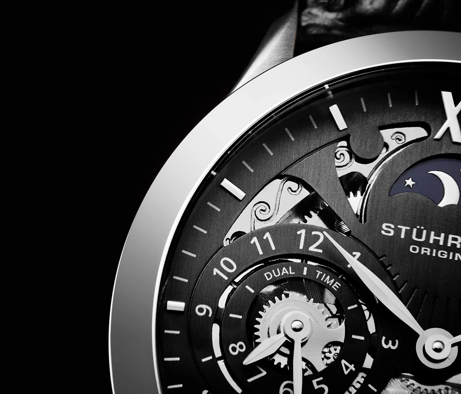 - Get lost in the details of the animated AM/PM indicator, second time-zone subdial with matching leaf-style hands, and skeletonized dial presentation.